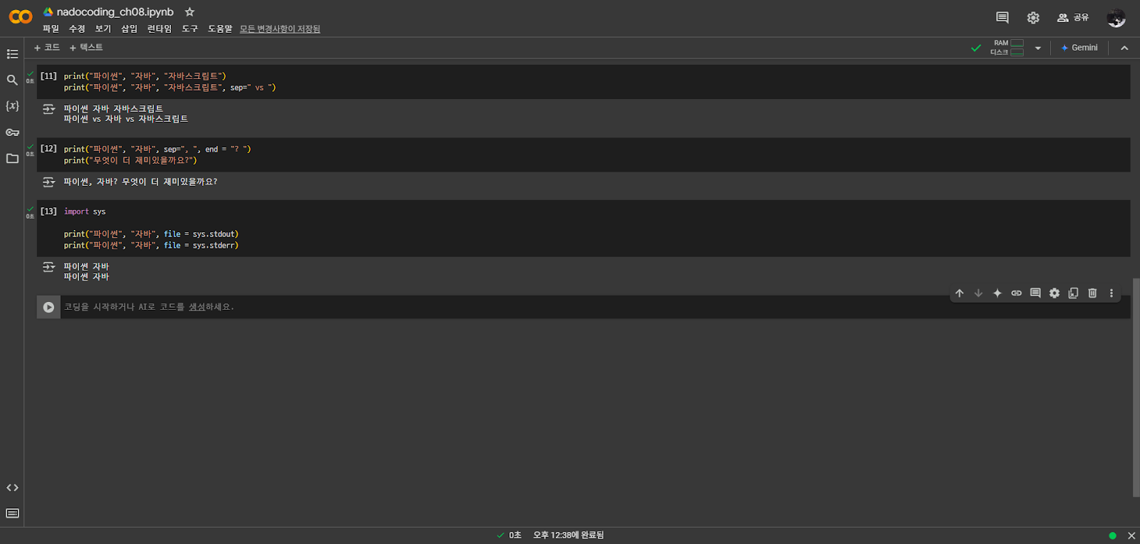sys.stdout : 표준 출력 (현재 표준 출력인 VSCode의 터미널에 결과를 출력하라)